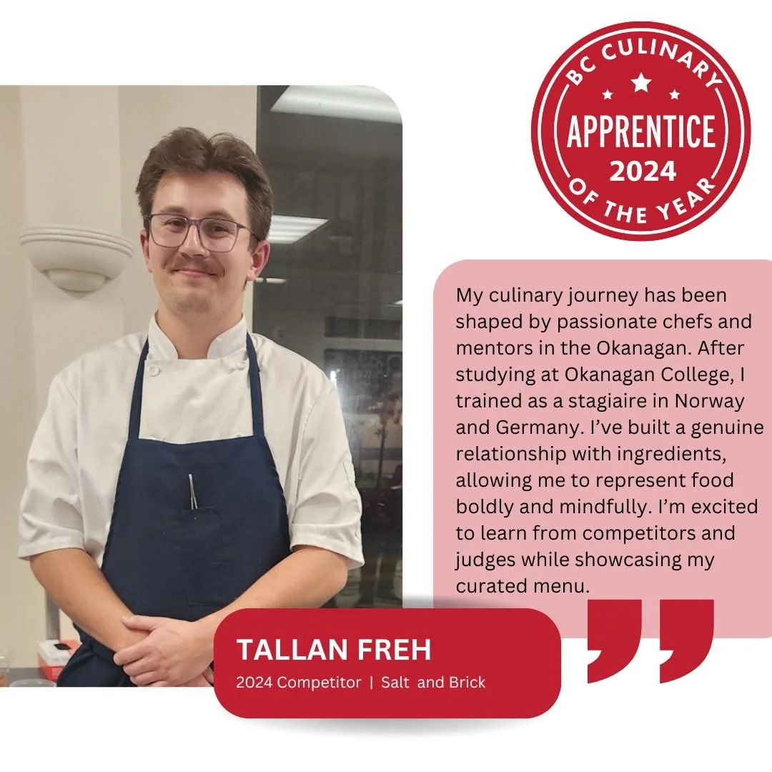 Tallan Freh is a 23-year-old professional chef based in Kelowna, British Columbia, and a proud member of Junior Team Canada. After graduating from Okanagan College in 2021, he gained valuable experience working alongside some of the top chefs across the Okanagan and at Published on Main in Vancouver, where he further developed his culinary skills. He has also completed stages in Germany and Norway, learning new techniques and exploring different culinary traditions. In 2025, Tallan was recognized as Canada’s Junior Chef of the Year, reflecting his dedication to learning and growth. He approaches cooking with curiosity and care, focusing on refining his craft while creating dishes that bring people together and highlight the best of Canadian cuisine.